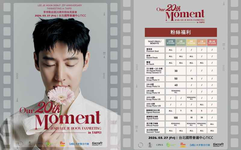 延續出道 20 週年的重要里程碑,李帝勳於今年一月底正式展開巡迴粉絲見面會《Our 20th Moment》,自東京啟程,陸續前往大阪、首爾、吉隆坡、香港等地,而台北站也確定將於2026年3月27日(五)晚間19:00,在台北國際會議中心TICC 盛大舉行。為了這次再度來台,李帝勳也特別錄製問候影片,用中文向粉絲拜年並傳達心意,直言「想到能和大家一起度過特別又開心的時光,就感到非常幸福」,希望當天「大家都能真心喜歡每一個瞬間」,更溫柔喊話:「請輕鬆地帶著好心情和笑容來吧,我們台北見!」展現滿滿期待與愛意。本次見面會票價分為NT$5,880、5,200、4,200、3,200 元,另設有愛心身障票 NT$$2,600元。向來寵粉的李帝勳也誠意準備多項福利,包括彩排Sound Check、擊掌Hi-touch、歡送 Hi-bye、1對1/1對25 合影、親筆簽名拍立得與簽名海報、官方海報,以及全體觀眾皆可獲得的 「台北限定紀念票根」。門票將透過拓元售票系統販售,於 2026年3月1日(日)下午3:01開賣,更多活動相關資訊,請留意主辦單位大步整合行銷後續官方公告。暌違已久再度站上台北舞台,李帝勳將以滿滿心意回應粉絲長久守候,讓《Our 20th Moment》成為2026年春季最具情感溫度的粉絲盛會。