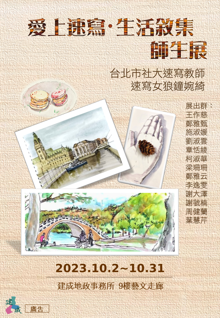 「愛上速寫,生活敘集/師生展」即日起至10月31日,在建成地政事務所九樓藝文走廊進行多達37幅作品的聯合展出!在國際間受到各界喜愛的城市速寫藝術潮流,目前在台北市社大也有課程展開教學,由於速寫作品豐富多元,難得的機會將讓人一飽眼福,更能放慢腳步欣賞生活藝術的魅力!