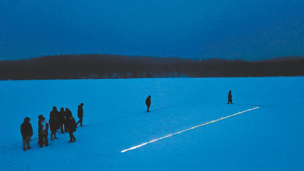 林昶戎鑿穿結冰的湖面,將LED燈條埋入雪地裡,藉由行動電源讓燈條發亮,極白純粹的光線穿越冰層,喚起觀眾對真實與想像的寧靜思考,呈現極冷環境中的神祕與美感。