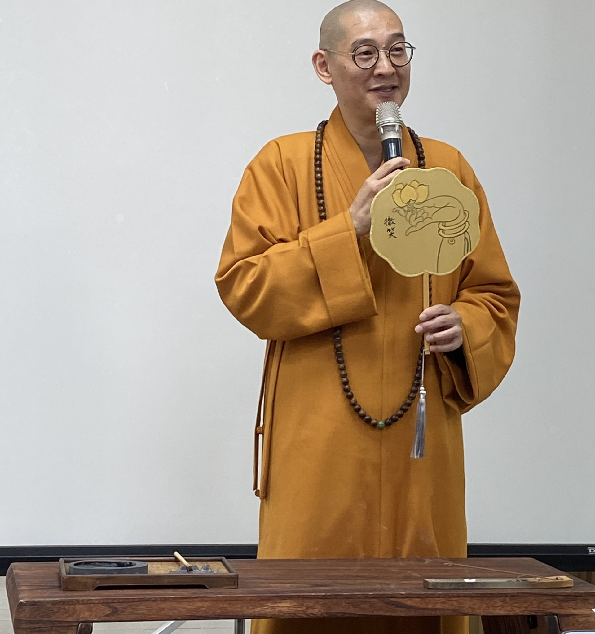 圖說:大慧法師即席揮毫於絹扇《拈花微笑》並將這幅書畫絹扇贈送給在場的孩童,寓意「廣結善緣」