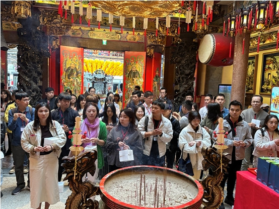 除了浪漫花海與手作體驗,活動也帶領參加者前往士林神農宮參拜月老祈求良緣。神農宮月老以站姿示人,一手持拐杖、一手牽引象徵姻緣的大紅線,為尋找真愛的信眾牽起緣分。現場參加者點燈祈福,期盼在月老加持下,遇見那位「剛剛好」的對象,為愛情增添一份信念與祝福。